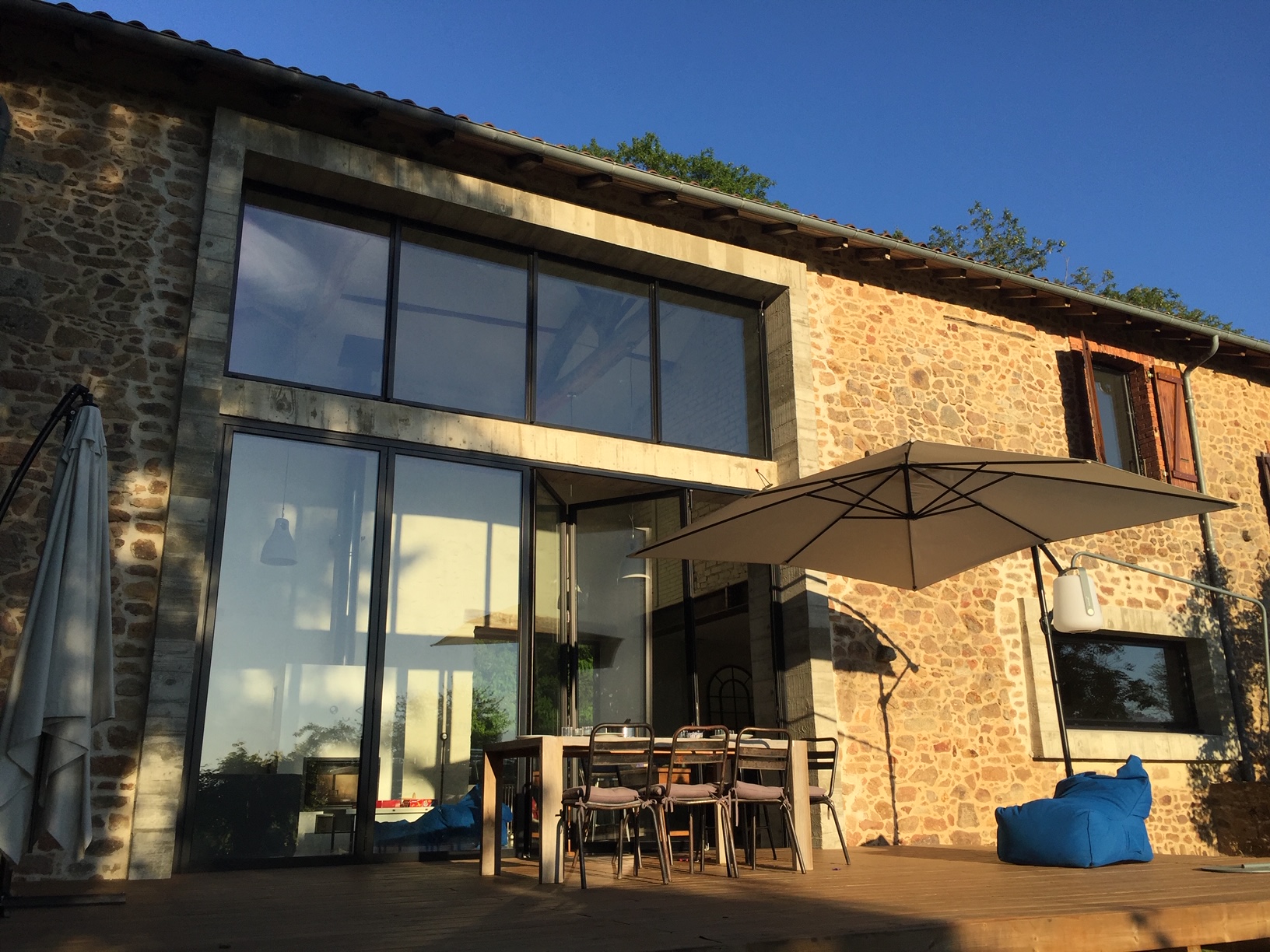 La grange est ainsi devenue un séjour cathédrale ouvert sur une terrasse orientée sud-ouest avec vue imprenable sur la campagne environnante.