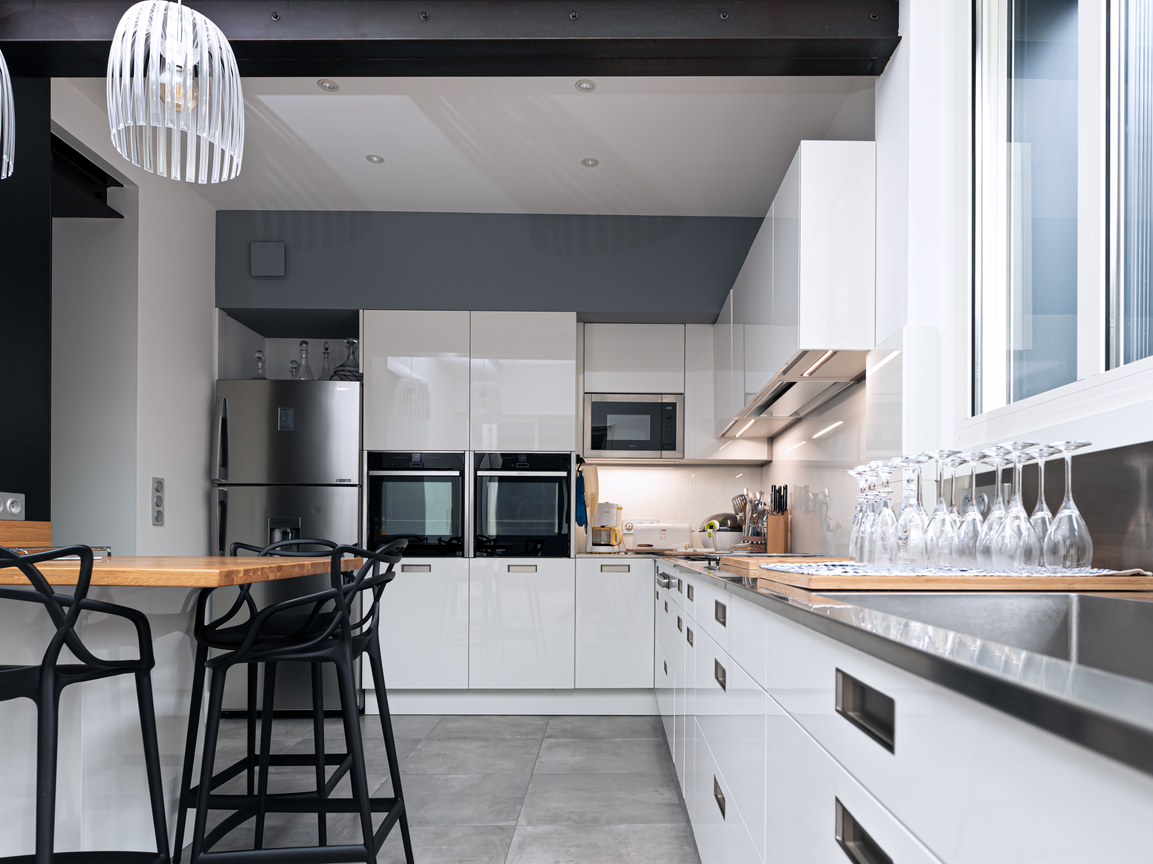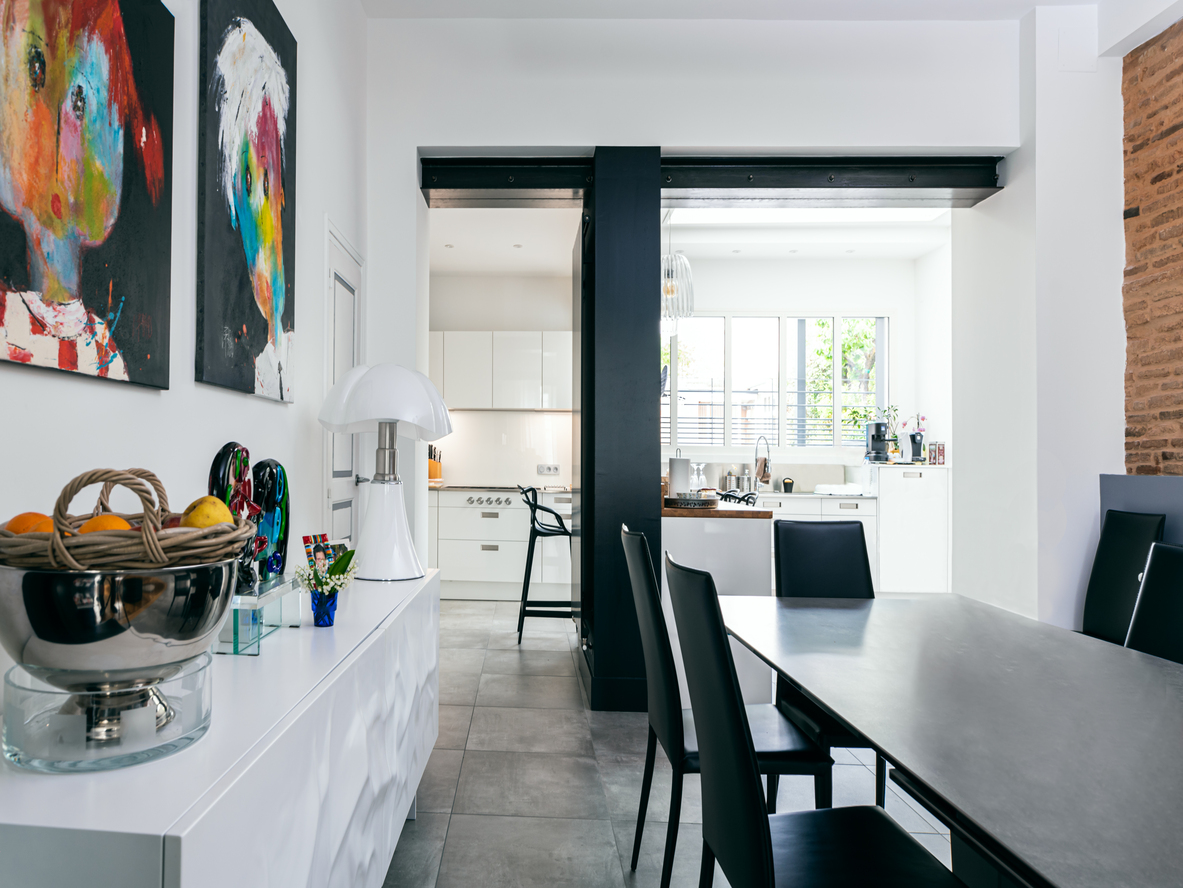 Le projet consistait en la réhabilitation du rez-de-chaussée d’une maison de ville répartie sur 3 niveaux, avec pour objectif de créer une zone de nuit en bas et permettre à ses propriétaires de vivre sur un plateau de plain-pied. La question s’est posée de vendre le bâtiment et de racheter ou faire construire ailleurs, avec pour objectif de créer un volume en plain-pied. Finalement, le projet a été de créer un esprit de type loft au rez-de-chaussée, de construire une extension sur le patio arrière et de rénover l’ensemble des espaces intérieurs et extérieurs de manière contemporaine. Les propriétaires conservaient ainsi la localisation idéale du bâtiment et avaient la sensation de changer de lieu de vie grâce aux travaux de rénovation.