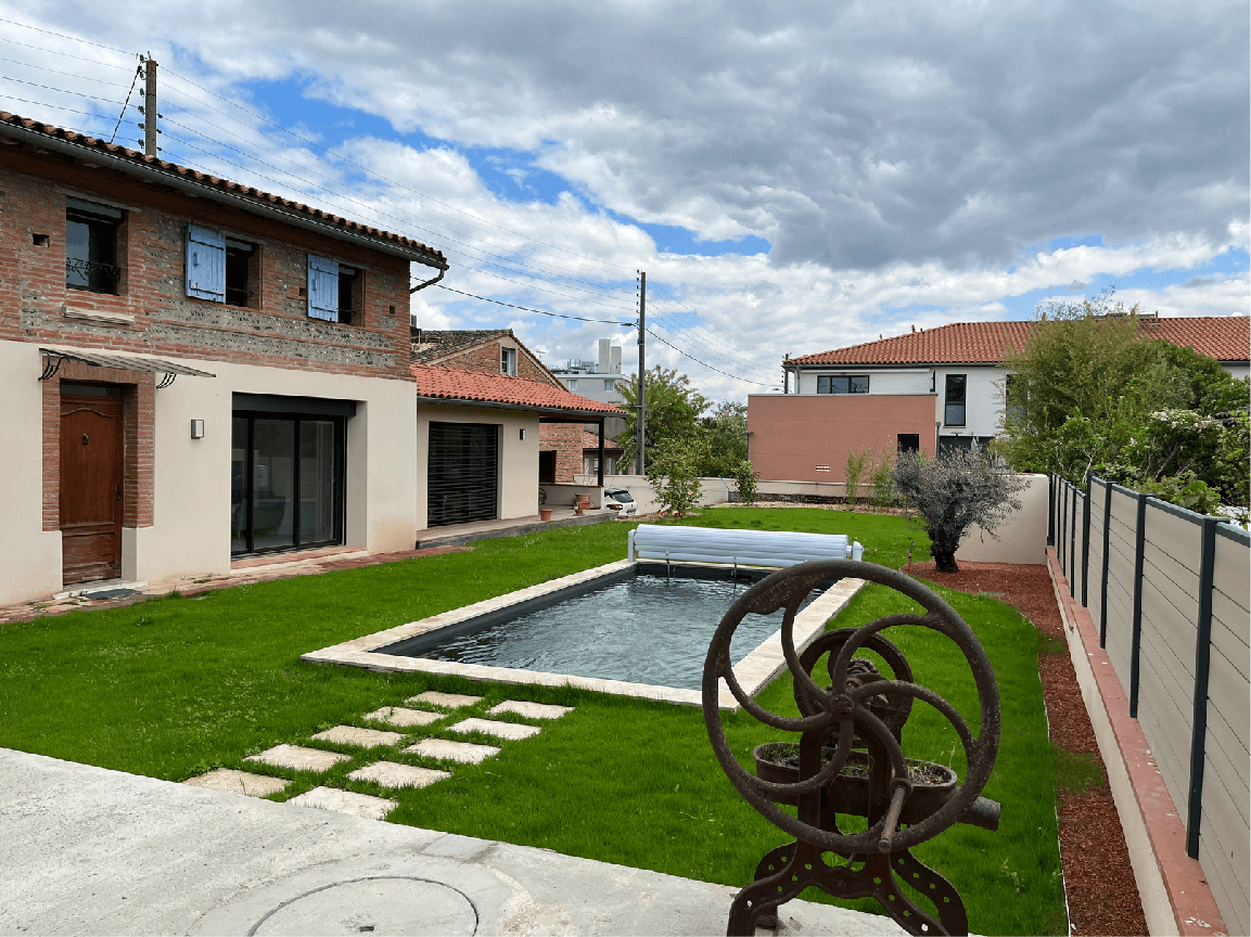 La réhabilitation de manière contemporaine du bâti existant de type toulousain comprenait la création de grandes ouvertures en façade donnant sur le jardin afin de créer un jeu de dedans-dehors, la dépose et repose du plancher intérieur du R+1 afin de gagner de la hauteur sous plafond au RDC, la restructuration des circulations et des points de vue intérieurs et depuis la maison vers le jardin, le traitement paysager avec la création d’une piscine et d’un espace extérieur de détente.