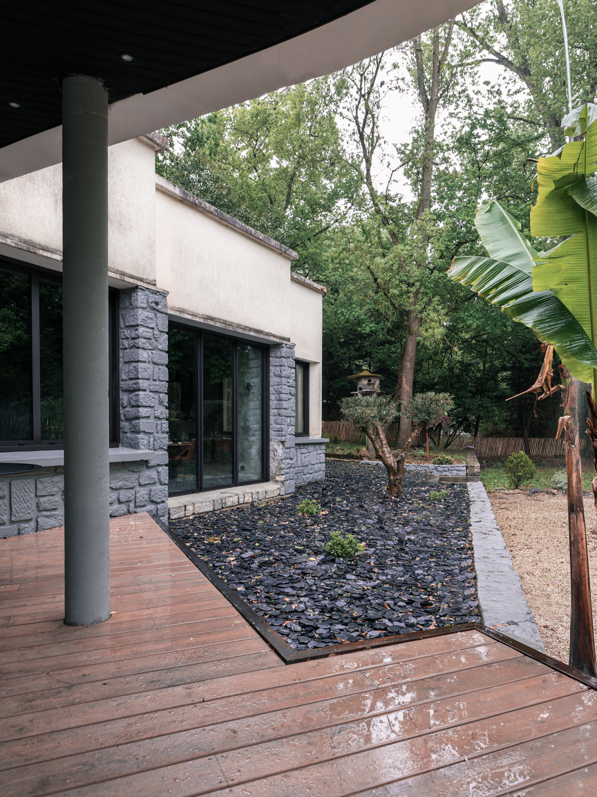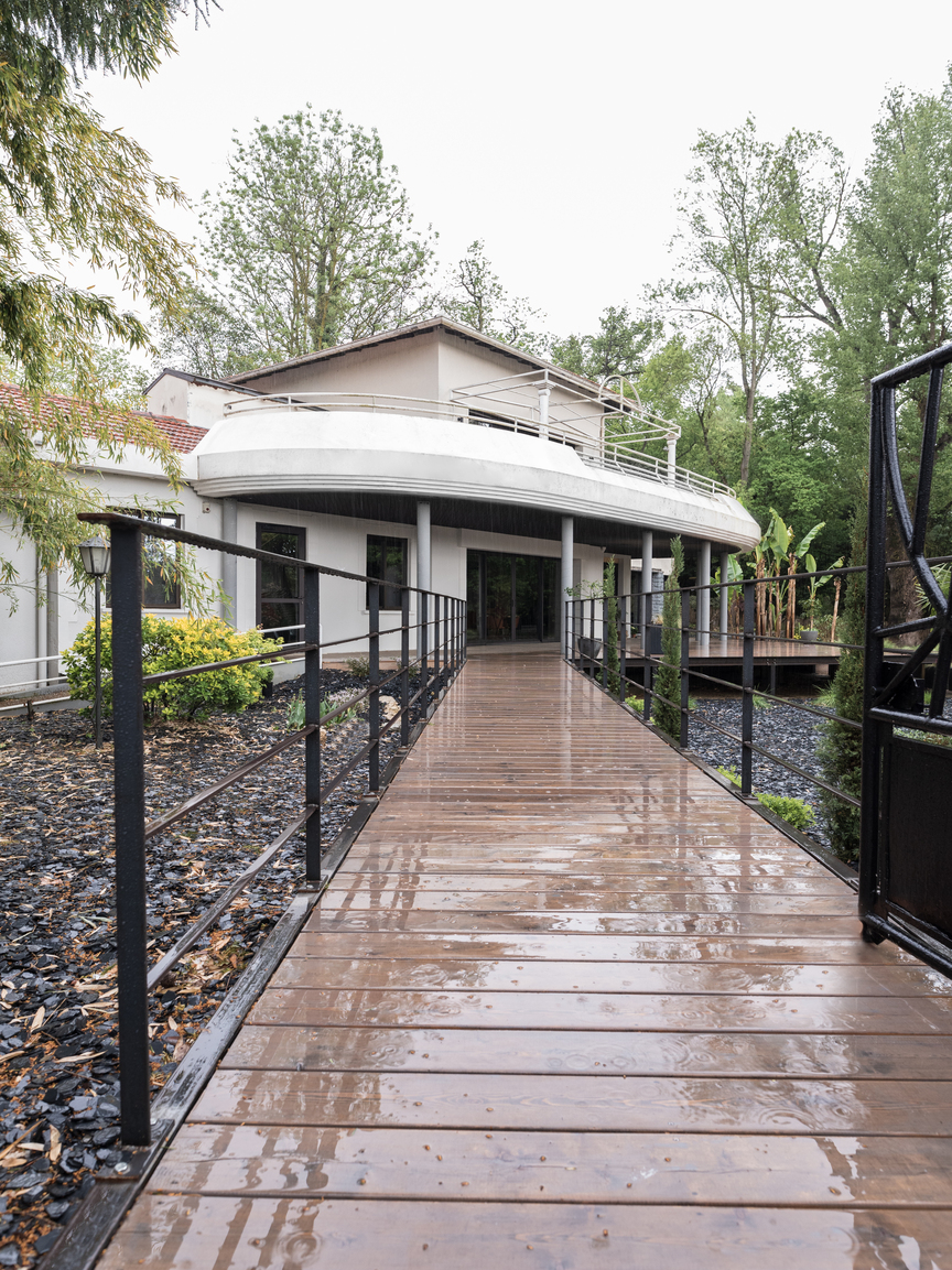 Un autre point marquant du projet a été la connotation maritime du bâtiment par sa forme originelle et la présence d’un ruisseau sur la parcelle. Ainsi, une passerelle a été créée pour accéder depuis la rue et une terrasse sur pilotis en pointe, tel un belvédère donnant sur le ruisseau, vient accentuer cet aspect maritime.
